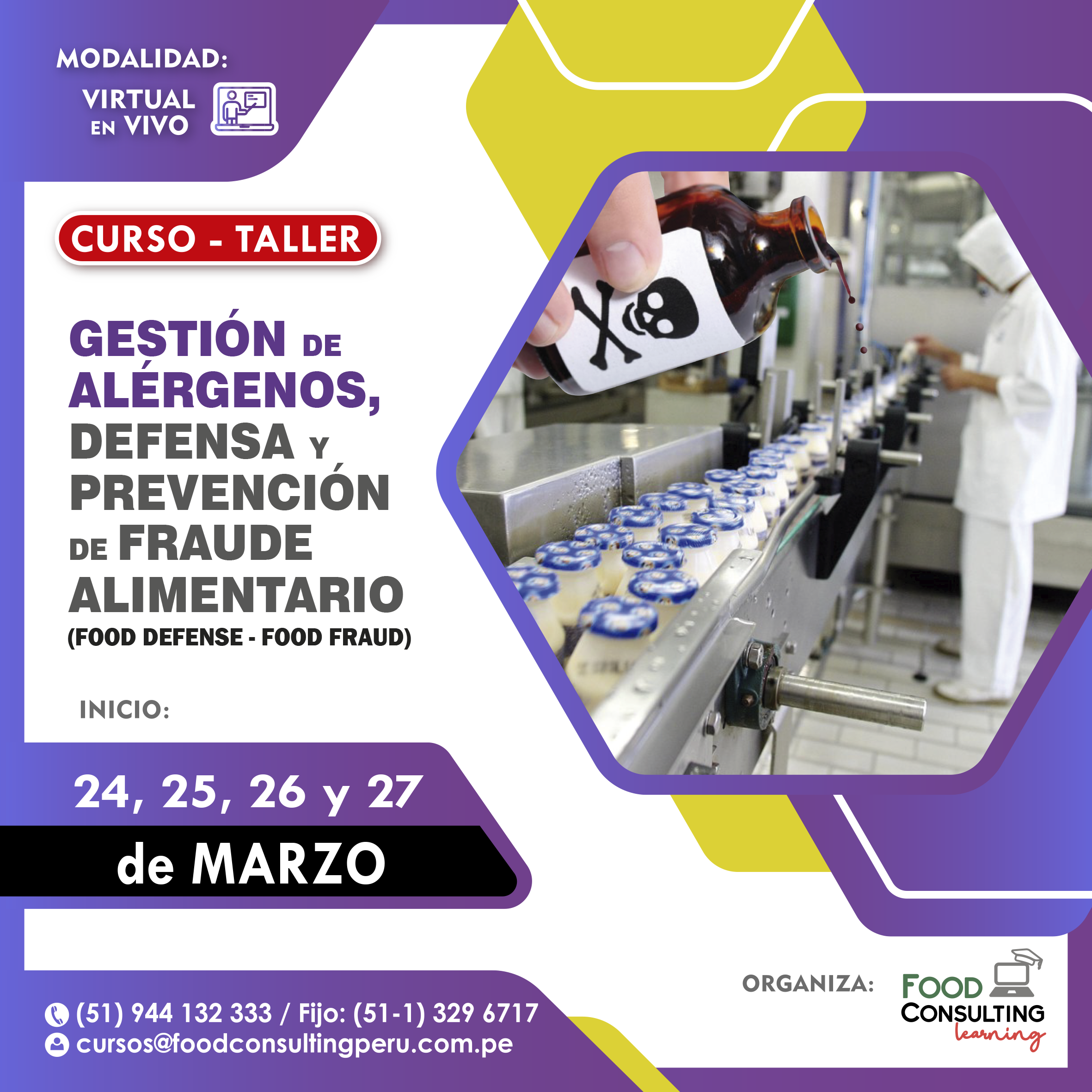 Dirigido a: Empresarios, Gerentes, Profesionales, Jefes de Calidad y/o Producción, Supervisores, Técnicos de Aseguramiento de Calidad, Asistentes de Calidad y/o Producción, Docentes, Estudiantes y en especial a los profesionales responsables de la calidad en los procesos de Recepción, Producción, Almacenamiento y Distribución de Alimentos y Bebidas.